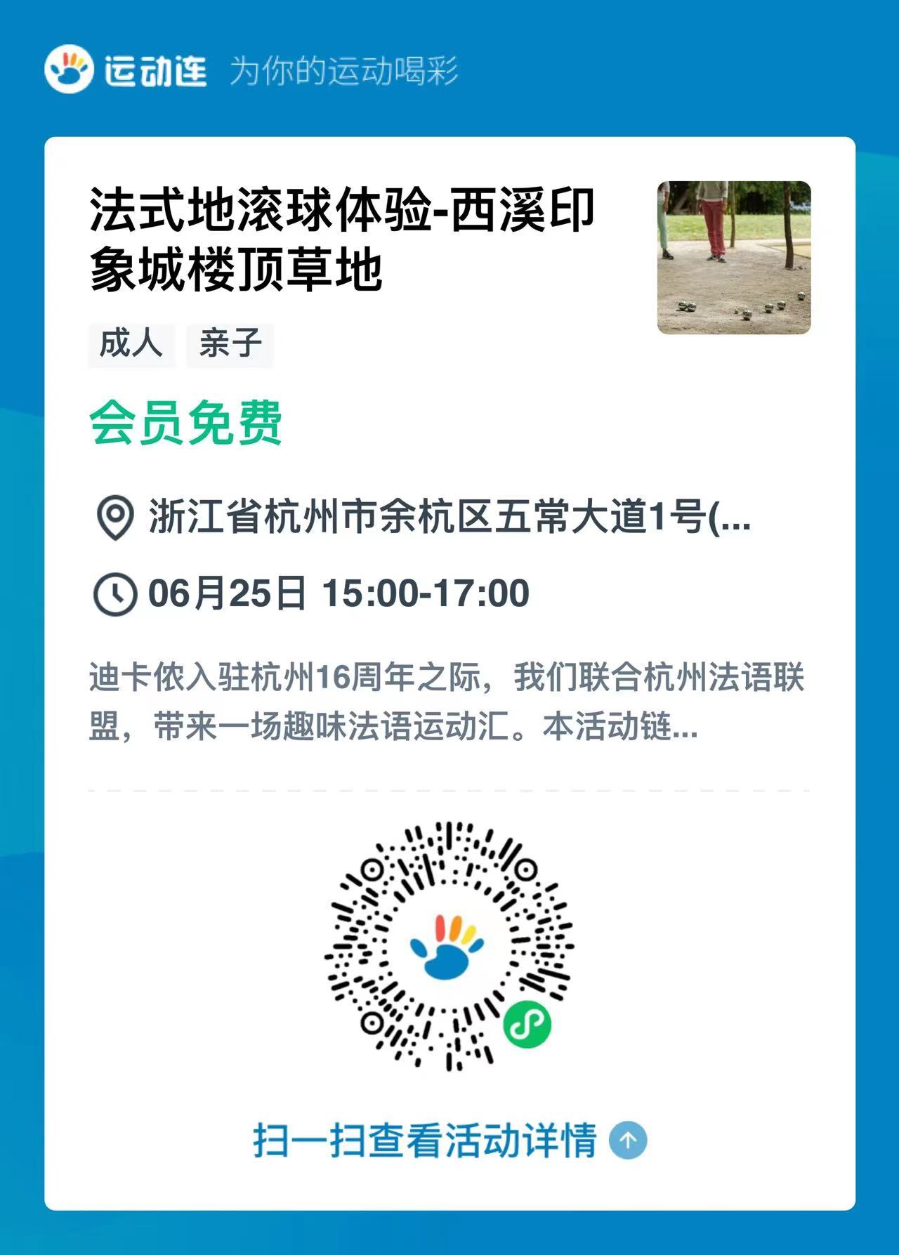 本周六(6月25日),杭州法语联盟+杭州迪卡侬西溪店邀请大家来参加一场《法式趣味运动汇》,大人,小朋友都可以来打卡哦!还可以来现场体验法式地滚球哦!